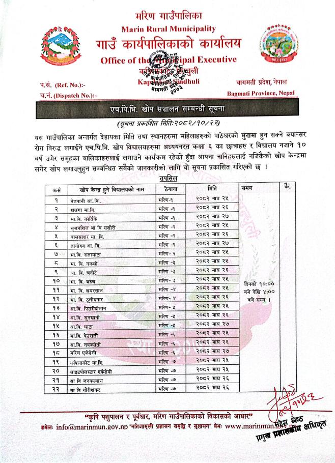 एच.पि.भि. खोप सञ्चालन सम्बन्धी सूचना।