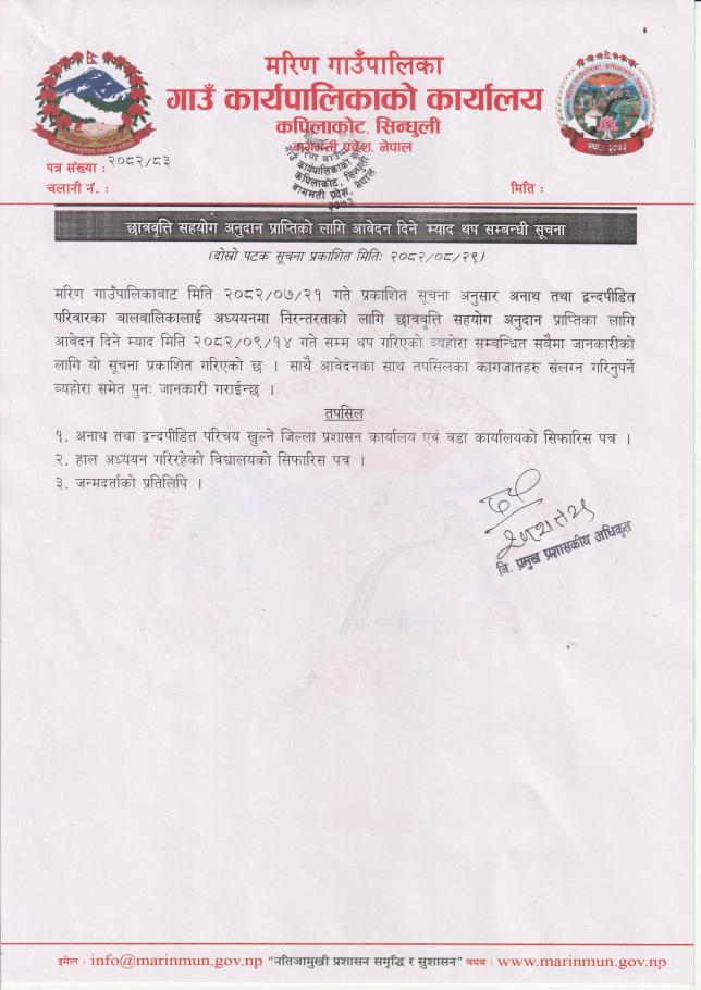 छात्रवृत्ति सहयोग अनुदान प्राप्तिको लागि आवेदन दिने म्याद थप सम्बन्धी सूचना