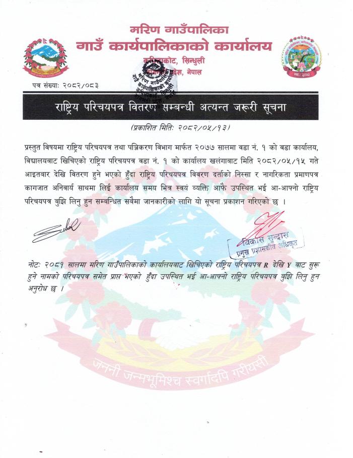 राष्ट्रिय परिचयपत्र वितरण सम्बन्धी अत्यन्त जरुरी सूचनन।