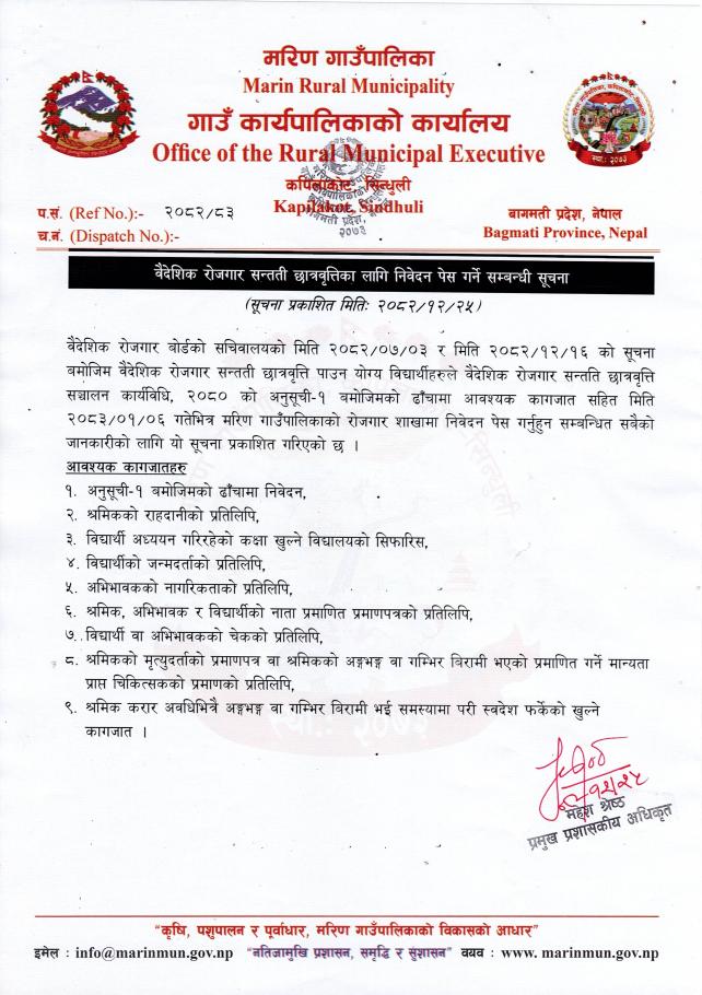 वैदेशिक रोजगार सन्तती छात्रवृत्तिका लागि निवेदन पेस गर्ने सम्बन्धी सूचना।