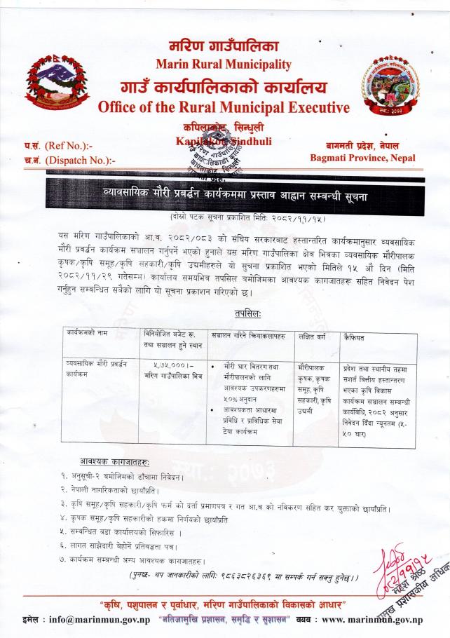 व्यावसायिक मौरी प्रबर्द्धन कार्यक्रममा प्रस्ताव आह्वान सम्बन्धी सूचना