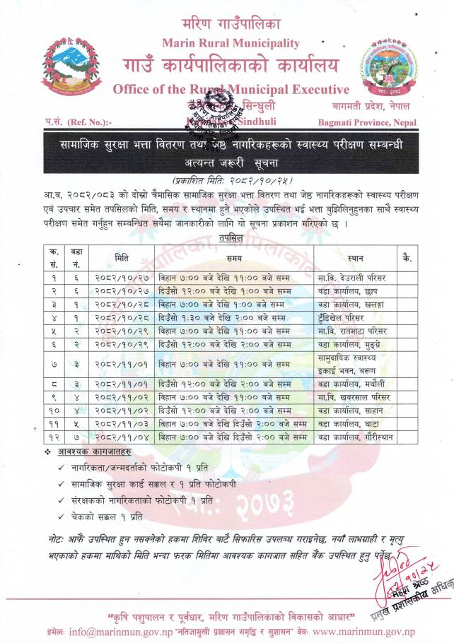 सामाजिक सुरक्षा भत्ता वितरण तथा जेष्ठ नागरिकहरूको स्वास्थ्य परीक्षण सम्बन्धी अत्यन्त जरूरी सूचना