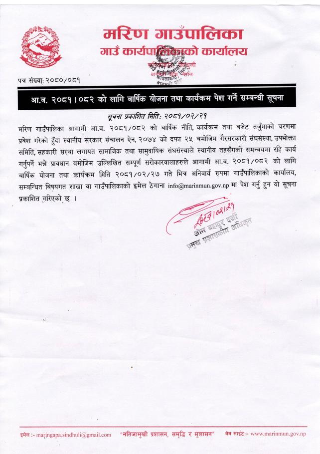 आ.व. २०८१/०८२ को लागि वार्षिक योजना तथा कार्यक्रम पेश गर्ने सम्बन्धी सूचना
