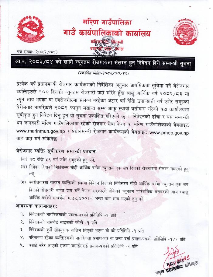 आ.व २०८३/०८४ को लागि न्यूनतम रोजगारीमा संलग्न हुन निवेदन दिने सम्बन्धी सूचना।