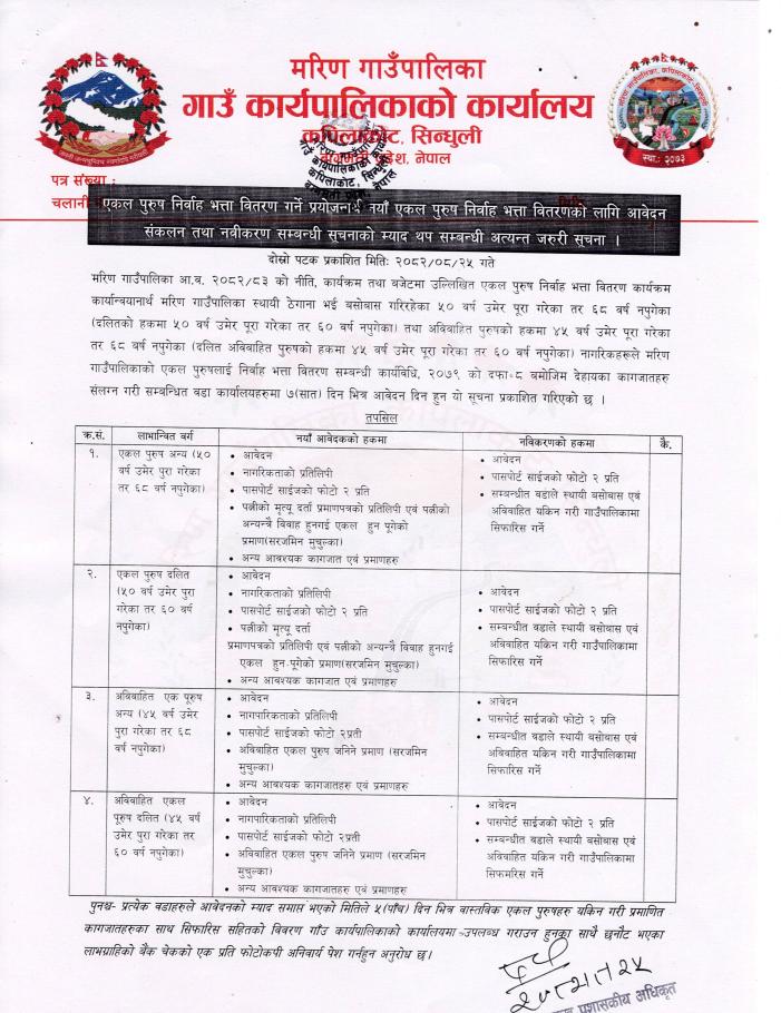 एकल पुरुष निर्वाह भत्ता वितरण गर्ने प्रयोजनर्थ नयाँ एकल पुरुष निर्वाह भत्ता वितरणको लागि आवेदन संकलन तथा नवीकरण सम्बन्धी सूचनाको म्याद थप सम्बन्धी अत्यन्त जरुरी सूचना।