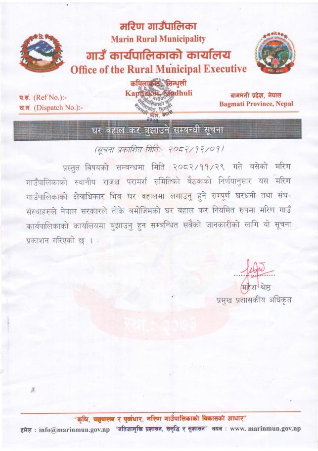 घर वहाल कर बुझाउने सम्बन्धी सूचना।