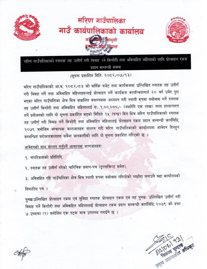 मरिण गाउँपालिकाको स्नातक तह उत्तीर्ण गरी विबाह गर्ने किशोरी तथा अविबाहित महिलाको लागि प्रोत्साहन सकम प्रदान सम्बन्धी सूचना।