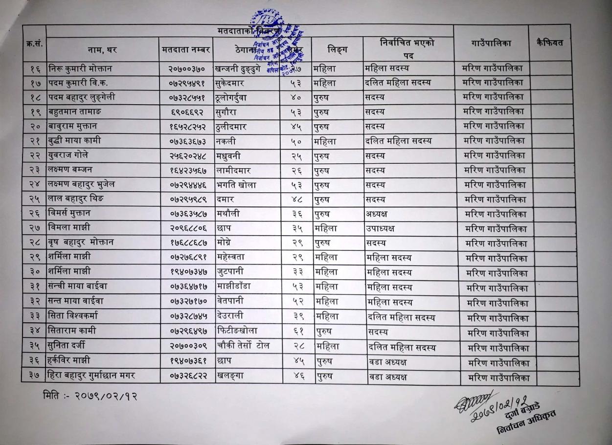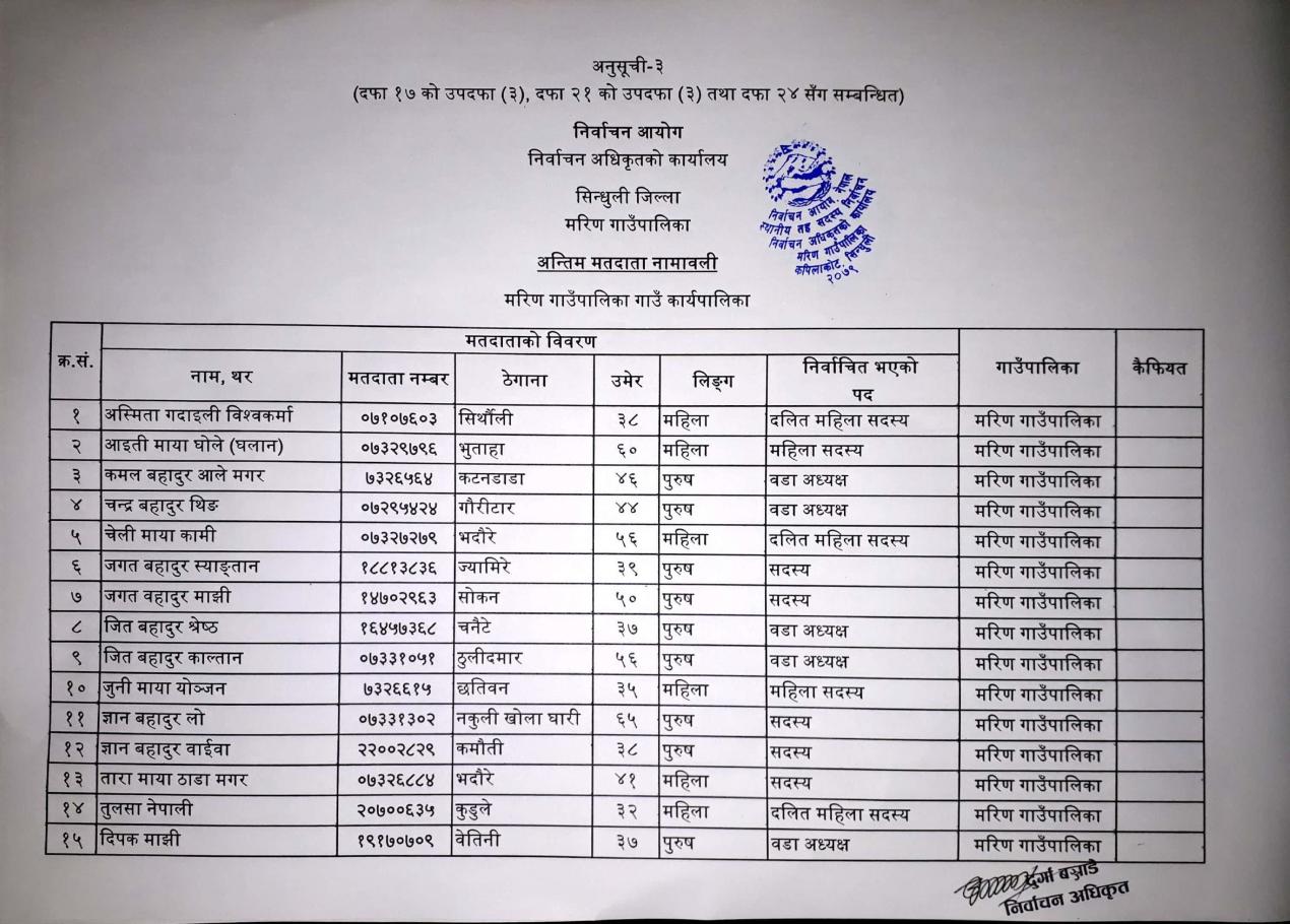 मरिण गाउँपालिका गाउँ कार्यपालिकाको महिला र दलित वा अल्पसङ्ख्यक सदस्य पदको निर्वाचन प्रयोजनको लागि अन्तिम मतदाता नामावली प्रकाशन गरिएको ।