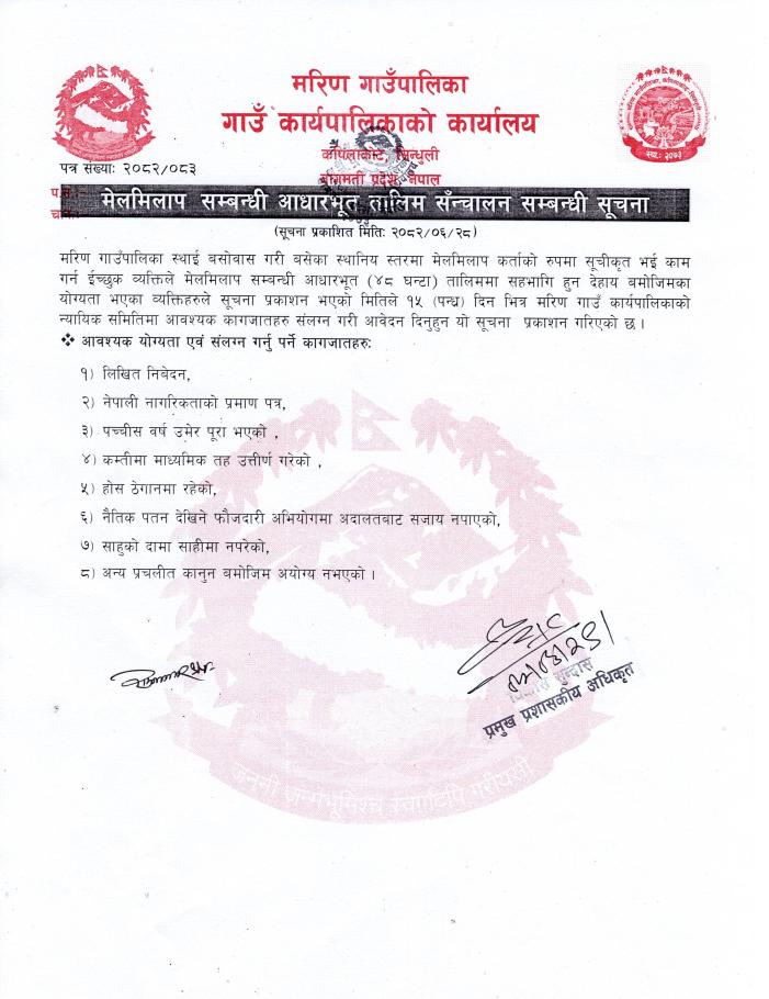 मेलमिलाप सम्बन्धी आधारमूत (४८ घन्टा) तालिम सन्चालान सम्बन्धी सूचना।