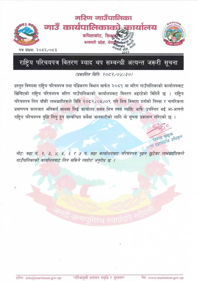 राष्ट्रिय परिचयपत्र वितरण म्याद थप सम्बन्धी अत्यन्त जरुरी सूचना