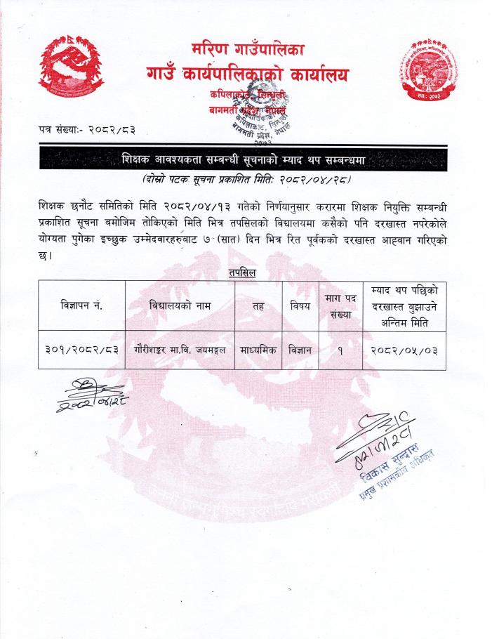 शिक्षक आवश्यकता सम्बन्धी सूचनाको म्याद थप सम्बन्धमा।