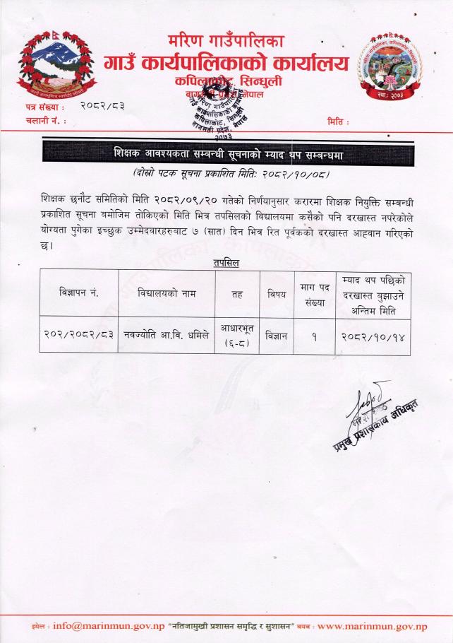 शिक्षक आवश्यकता सम्बन्धी सूचनाको म्याद थप सम्बन्धमा
