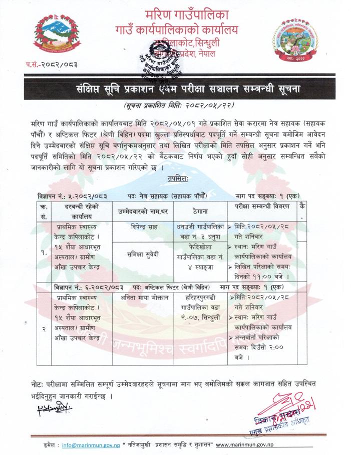 संक्षिप्त सूचि प्रकाशन एवम परिक्षा सञ्चालन सम्बन्धी सूचना।