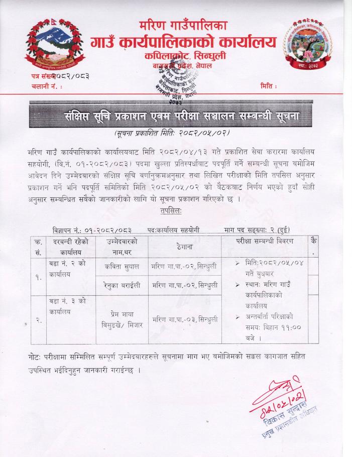 संक्षिप्त सूचि प्रकाशन एवम परीक्षा सञ्चालन सम्बन्धी सूचना(कार्यालय सहयोगी)