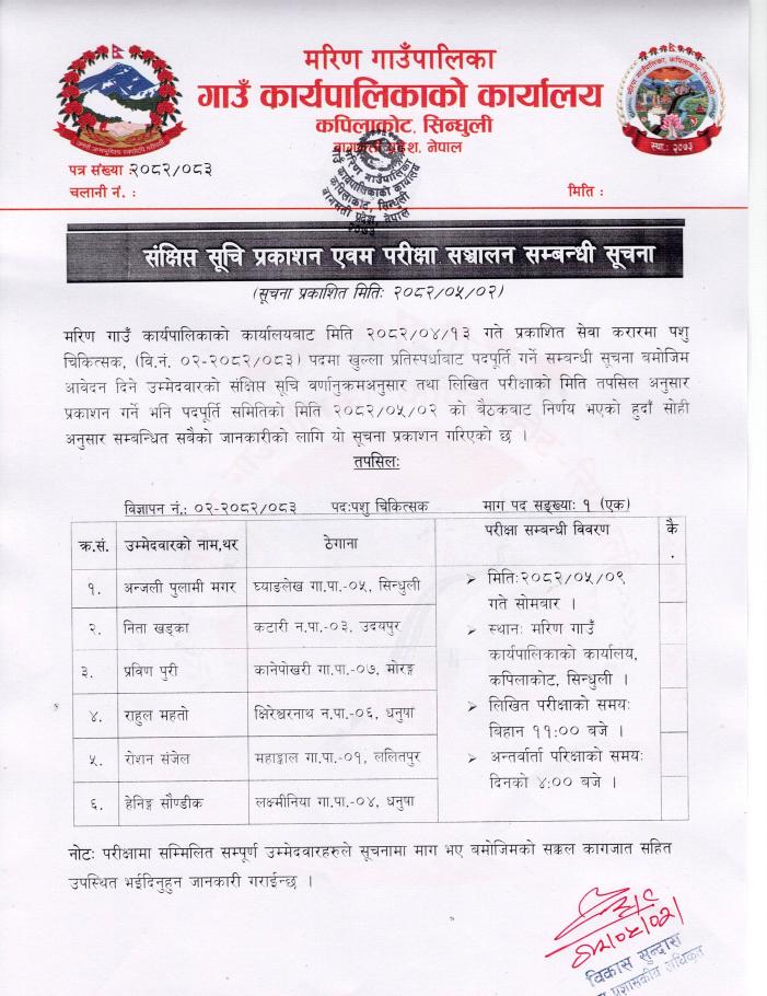 संक्षिप्त सूचि प्रकाशन एवम परीक्षा सञ्चालन सम्बन्धी सूचना(पशु चिकित्सक)