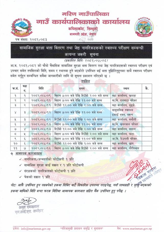 सामाजिक सुरक्षा भत्ता वितरण तथा जेष्ठ नागरिकहरूको स्वास्थ्य परीक्षण सम्बन्धी अत्यन्त जरूरी सूचना